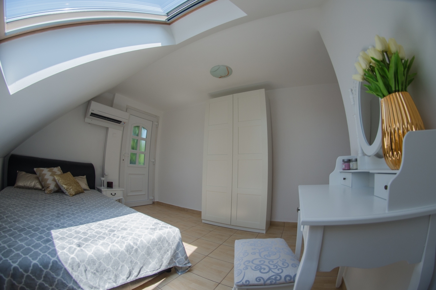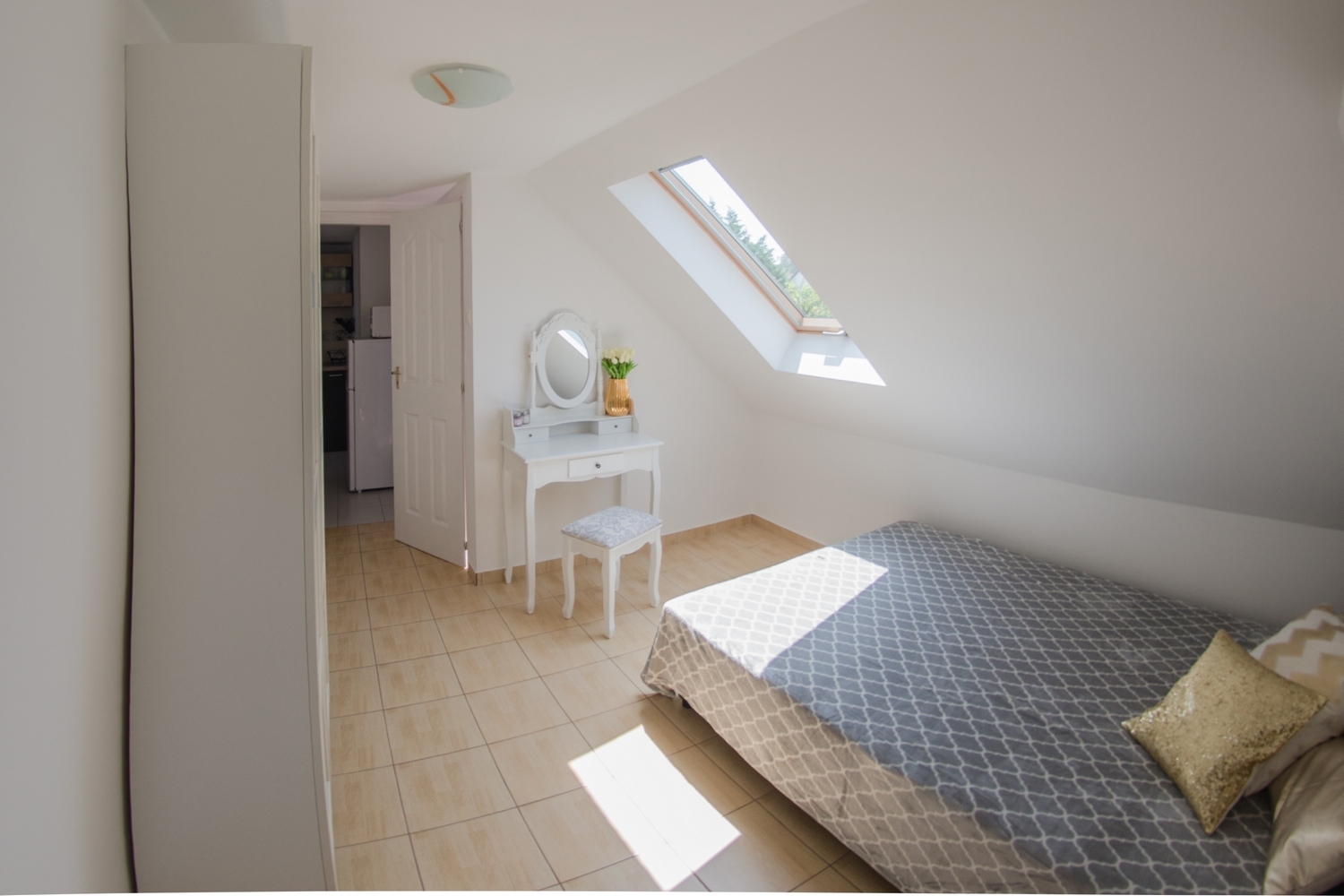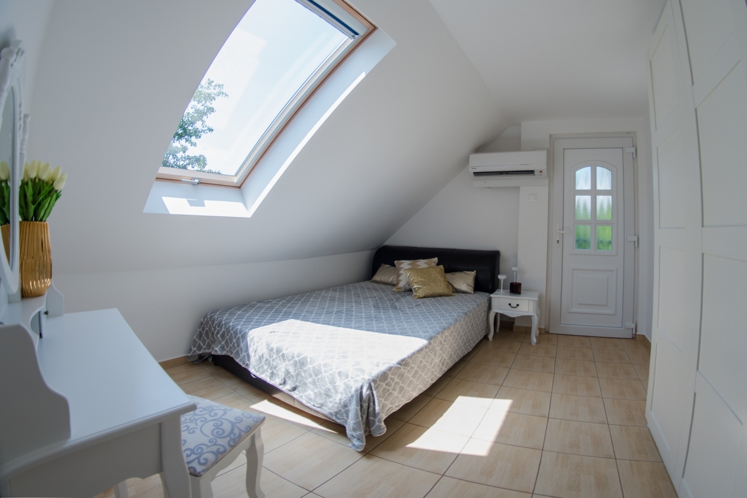 - Bal oldali tetőtéri apartman: 35m2-es apartman saját bejárattal, konyhával, fürdővel, nappali-étkezővel, melynek elrendezése a következő,: az egy teljes értékű hálószobán felül van egy tolóajtóval teljesen elszeparált kis hálószoba, illetve a nappali-étkezőben egy kinyitható kétszemélyes kanapé (összesen 2db 140×200-as franciaágy, 1db 140×200-as kinyitható kanapé) (4 fő részére). Az apartman csak lépcsőről közelíthető meg, kérlek ezt mindenképp mérlegeld mielőtt véglegesíted a foglalást!