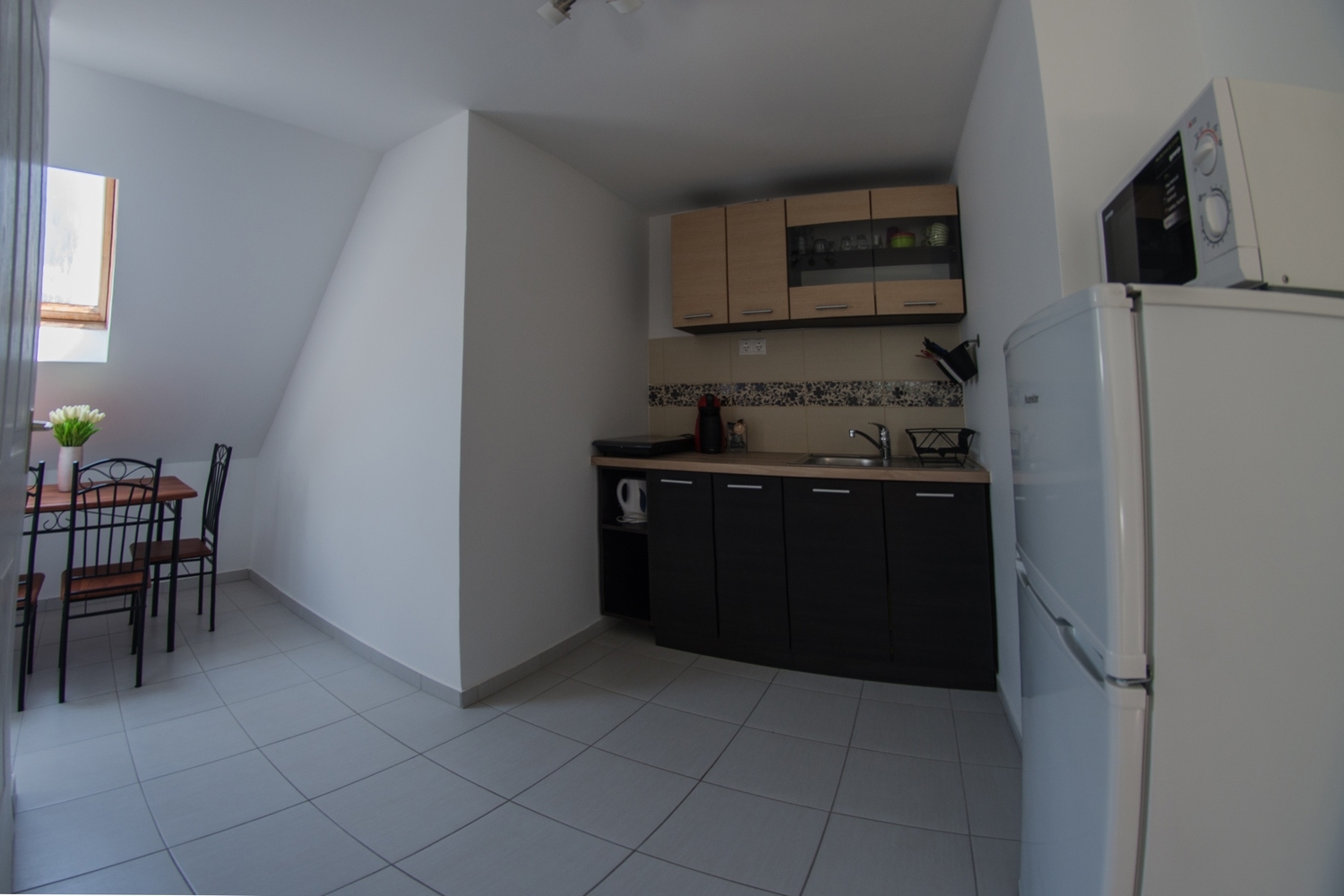 Az apartmanok konyhája teljesen felszerelt: hűtő fagyasztóval, mikró, indukciós főzőlap, kávéfőző, alapvető konyhai eszközök és fűszerek mind megtalálhatóak.